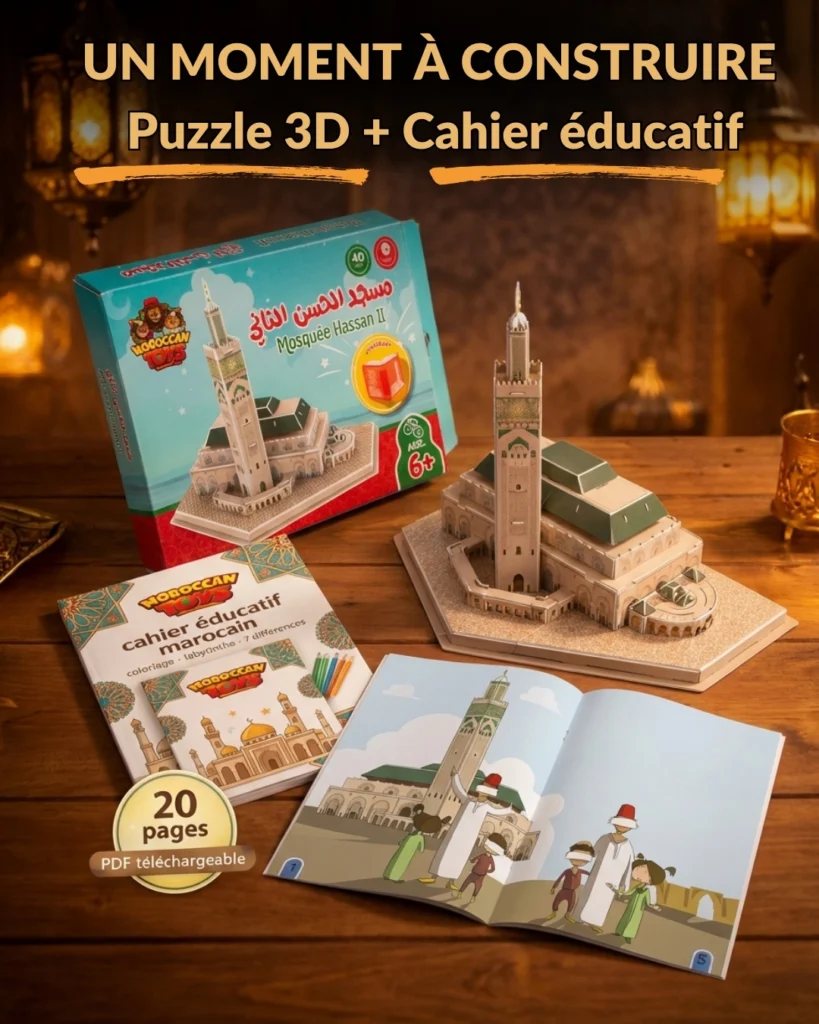 Un puzzle 3D éducatif inspiré de la Mosquée Hassan II, conçu pour aider les enfants à apprendre, se concentrer et partager un vrai moment en famille, loin des écrans.